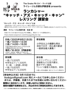 ※持ち物:レスリングシューズや運動靴などの室内履き、動きやすい服装、Tシャツ着替え用数枚、飲料、通しの方は昼食(近くにローソンや飲食店あります。)