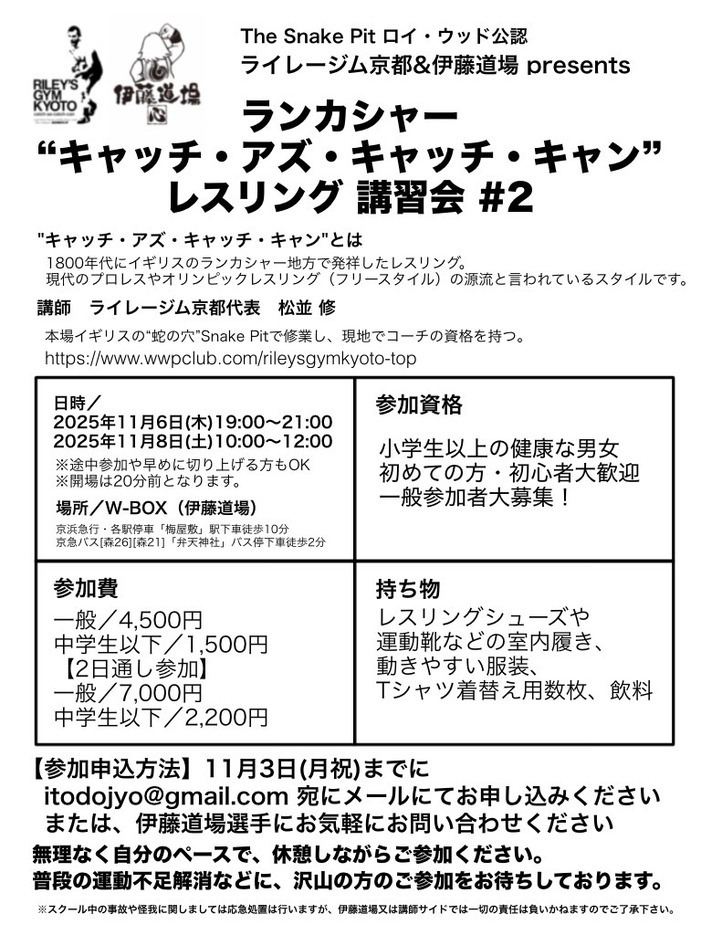 2回目となる、「キャッチ・アズ・キャッチ・キャン」レスリングの講習会を、W-BOX(伊藤道場)にて開催します。