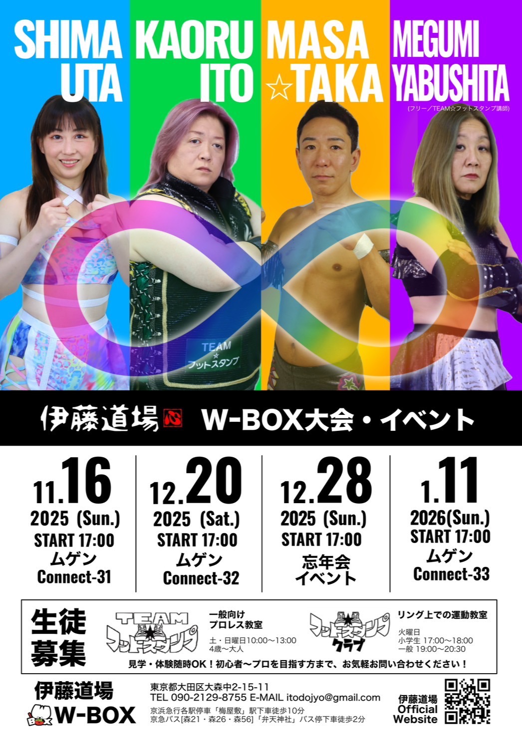 W-BOX [伊藤道場] 今後の予定2025-11-06W-BOX 今後の予定 (2025年11月~2026年1月) 『ムゲン Connect-31』 2025年11月16日(日) 開場 16:45 / 試合開始 17:00 『ムゲン Connect-32』 2025年12月20日(土) 開場 16:45 / 試合開始 17:00 『伊藤道場 忘年会イベント(仮)』 2025年12月28日(日) 開場 16:45 / 試合開始 17:00 『ムゲン Connect-33』 2026年1月11日(日) 開場 16:45 / 試合開始 17:00 NEWS,試合・イベント